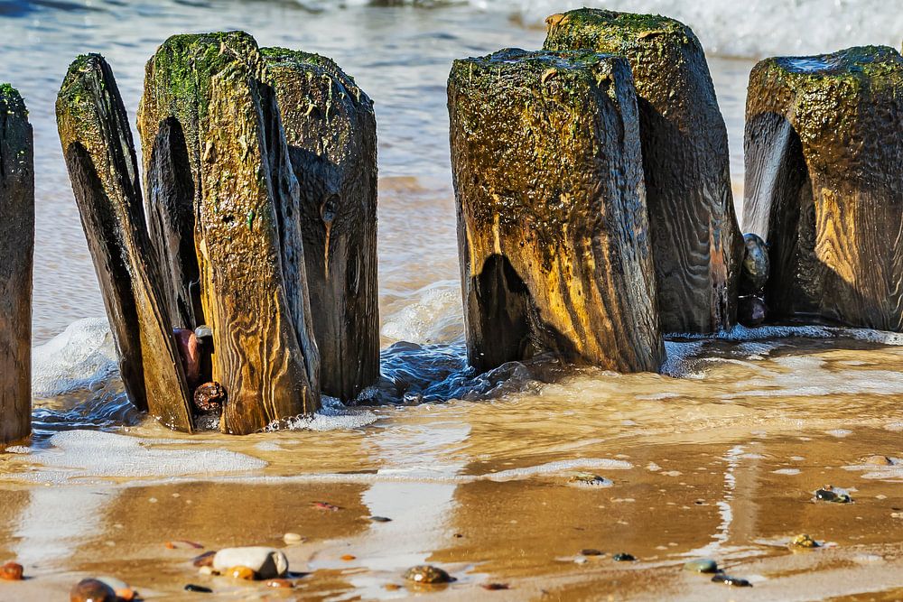 Buhnen am Strand der Ostsee bei Kolberg. Buhnen haben den Zweck, die Wellen zu brechen und die Abtragung der Küste zu verhindern. Kolberg, Westpommern, Polen, Europa