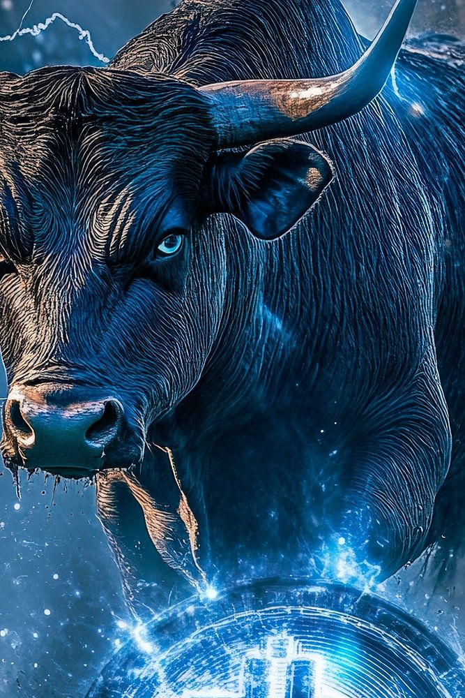 Ein kraftvoller Stier, umgeben von elektrisierenden Blitzen, symbolisiert die dynamische Welt der Kryptowährungen. Das strahlende Bitcoin-Symbol im Vordergrund verstärkt die Energie und Leidenschaft für digitale Innovation. Diese beeindruckende Darstellung eignet sich hervorragend für ein Büro, um Kreativität und unternehmerischen Geist zu inspirieren.