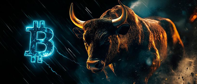 Ein kraftvoller Stier stürmt kraftvoll durch ein digitales Unwetter, während ein leuchtendes Bitcoin-Symbol symphonisch im Hintergrund flackert. Diese dynamische Darstellung verkörpert Stärke und Wachsamkeit – perfekt für ein Büro, um kreative Energie und Innovationsgeist zu fördern. Ein Blick auf diese Szene inspiriert zu neuen Ideen…