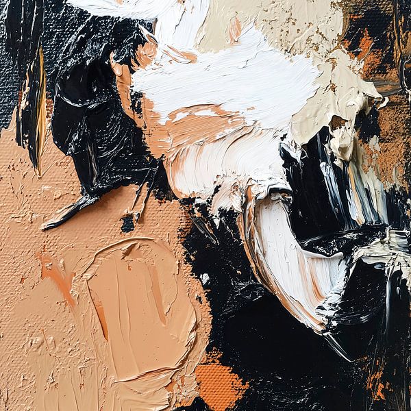 Ein abstraktes Gemälde mit dicken, pastosen Pinselstrichen. Die Farben sind überwiegend Erdtöne, kontrastiert mit Schwarz und strahlendem Weiß. Die Textur ist sehr deutlich sichtbar, wobei die Farbe in skulpturalen Formen aufgetragen wurde, die ein Gefühl von Bewegung und Tiefe erzeugen. Die Komposition ist dynamisch mit wirbelnden…