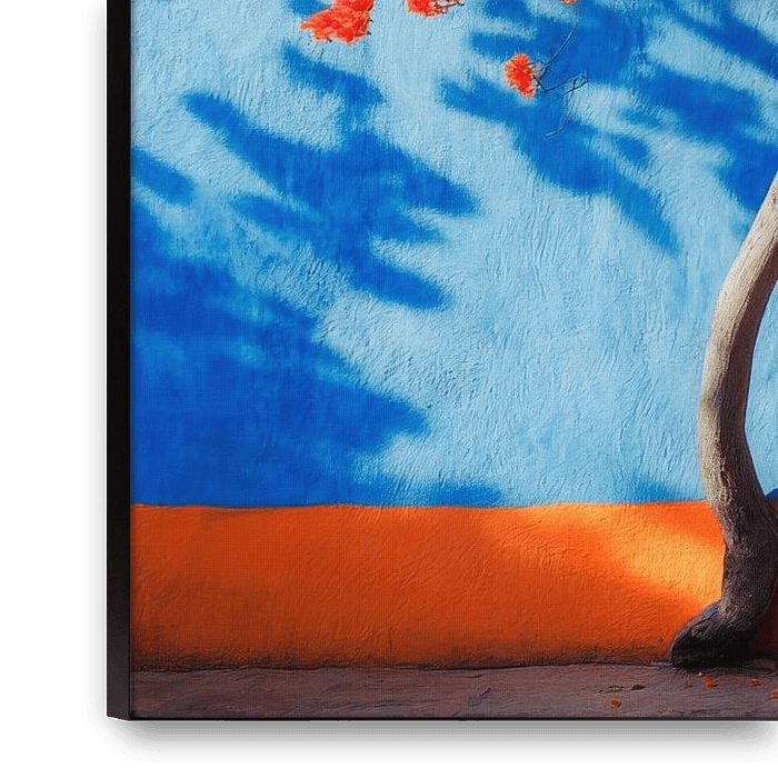 Ein leuchtendes Blau umarmt die Wände, während ein prächtiger Baum mit feurigen roten Blüten darüberthrönt. Die strahlende rote Tür, kunstvoll verziert, scheint ein Geheimnis zu bewahren. Schatten tanzen sanft auf dem Boden, als ob die Natur selbst diese harmonische Szenerie zum Leben erweckt. Ein Ort voller Farben und Geschichten!