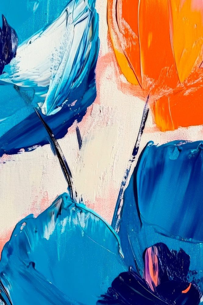Lebendige Farben treffen auf künstlerische Formen in diesem floralen Meisterwerk, wo strahlendes Blau und fröhliches Orange harmonisch miteinander spielen. Die dicken Pinselstriche verleihen Tiefe und Dynamik. Ideal für das Wohnzimmer, um eine einladende Atmosphäre zu schaffen und jedem Besucher ein Lächeln ins Gesicht zu zaubern.