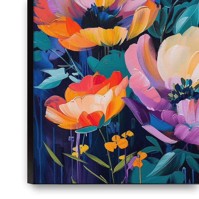 Wenn Ihr Interieur Farbe braucht, ist dieses Werk genau das Richtige für Sie! Bunte Blumen auf dunklem Hintergrund, im Stil eines Acrylgemäldes.