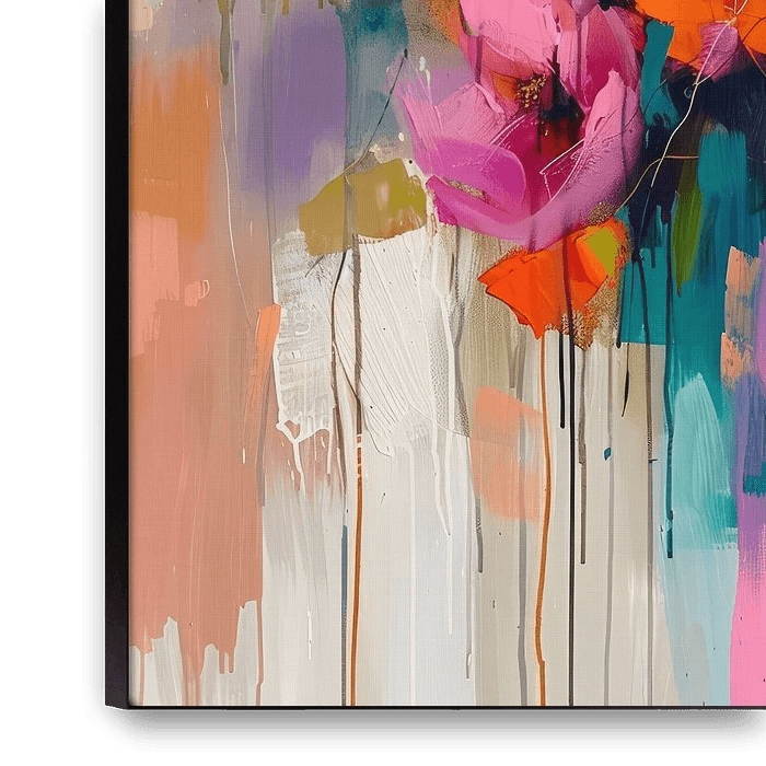 Bunte Blumen in Rosa, Blau und Orange. Ein besonderer Blickfang für Ihr Interieur! Modern und abstrakt. Wählen Sie Ihre eigene Größe und Material für dieses Werk und passen Sie es an.