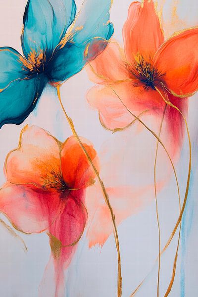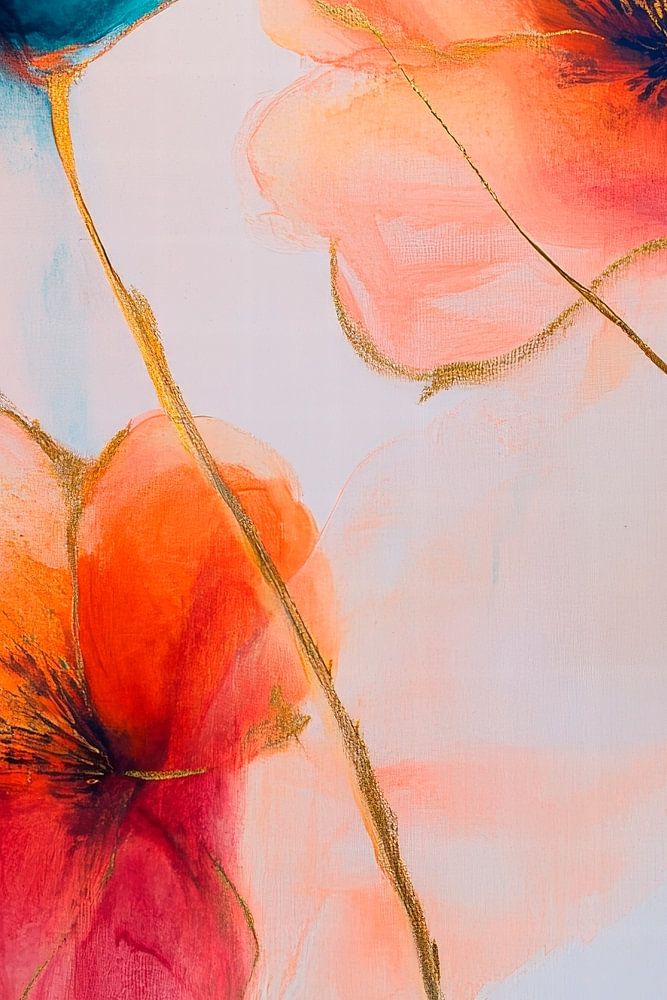 Sanfte Farbnuancen in Türkis und Koralle tanzen über die Leinwand und verleihen diesem Kunstwerk eine lebendige Leichtigkeit. Die floralen Motive strahlen Frische und Freude aus, ideal geeignet für das Schlafzimmer oder ein einladendes Wohnzimmer, wo sie die Sinne beleben und eine harmonische Atmosphäre schaffen.