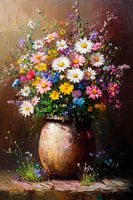 Ein betörendes Farbenmeer entfaltet sich in einem rustikalen Gefäß, das voller Lebensfreude erblüht. Strahlende Margeriten und lebhafte Wildblumen tanzen im sanften Licht, während die Erdigkeit des Tones des Topfes wunderbar mit der Frische der floralen Pracht harmoniert. Ein zauberhaftes Stillleben, das den Frühling in voller Blüte…
