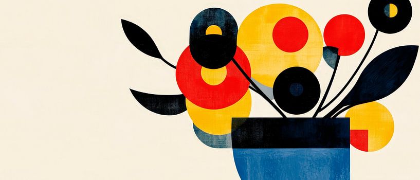 Mit lebhaften roten, gelben und schwarzen Kreisen, harmonisch kombiniert mit stilisierten Blättern, erzeugt dieses blühende Arrangement eine fröhliche und dynamische Aura. Die klare Linienführung und das moderne Design bringen frischen Schwung in jedes Wohnzimmer, schaffen eine einladende Atmosphäre und verwandeln den Raum in einen Ort…