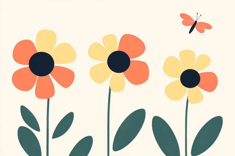 In einer sanften Farbpalette erblühen drei fröhliche Blumen mit leuchtenden Blütenblättern in warmen Tönen von Orange und Gelb. Ihre tiefschwarzen Herzen strahlen Lebendigkeit aus, während sanfte Blätter im Hintergrund harmonisch wirken. Über allem schwebt ein zarter Schmetterling und fügt dem Bild einen Hauch von Leichtigkeit und…