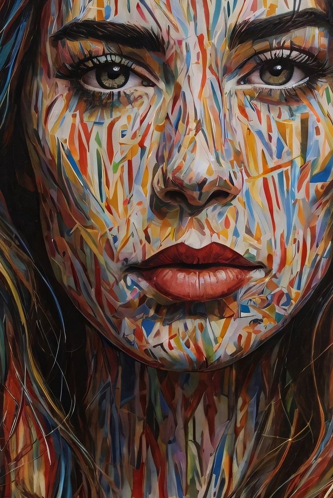 Entdecken Sie ein fesselndes modernes Kunstwerk, das mit dem Konzept des abstrakten Expressionismus spielt. Dieses atemberaubende Porträt einer Frau ist nicht nur ein visuelles Statement, sondern auch ein Symbol für die Komplexität menschlicher Gefühle. Die bunten Farbspritzer verleihen dem Werk eine dynamische und lebendige Textur, während der durchdringende Blick der Frau eine Geschichte erzählt, die über Worte hinausgeht. Dieses Gemälde eignet sich perfekt für ein zeitgenössisches Wohnzimmer oder ein inspirierendes Büro und verleiht jedem Raum einen Hauch von Modernität und künstlerischem Flair.