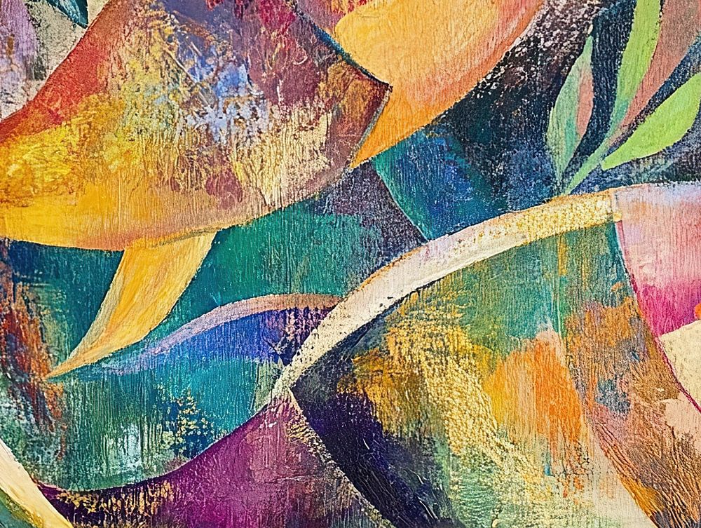 Details: Fisch, Gemälde, Kunst, Farben, Blätter, Gold, abstrakt, fröhlich, dekorativ, moderne Kunst