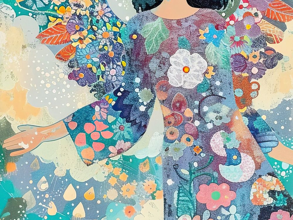 Bunte Frau mit Vögeln und Blumen - Dieses Bild zeigt eine Frau mit Blumen und Flügeln, umgeben von bunten Vögeln und einem schönen Hintergrund mit verschiedenen Formen und Pastellfarben, die dem Bild eine verträumte Atmosphäre verleihen.