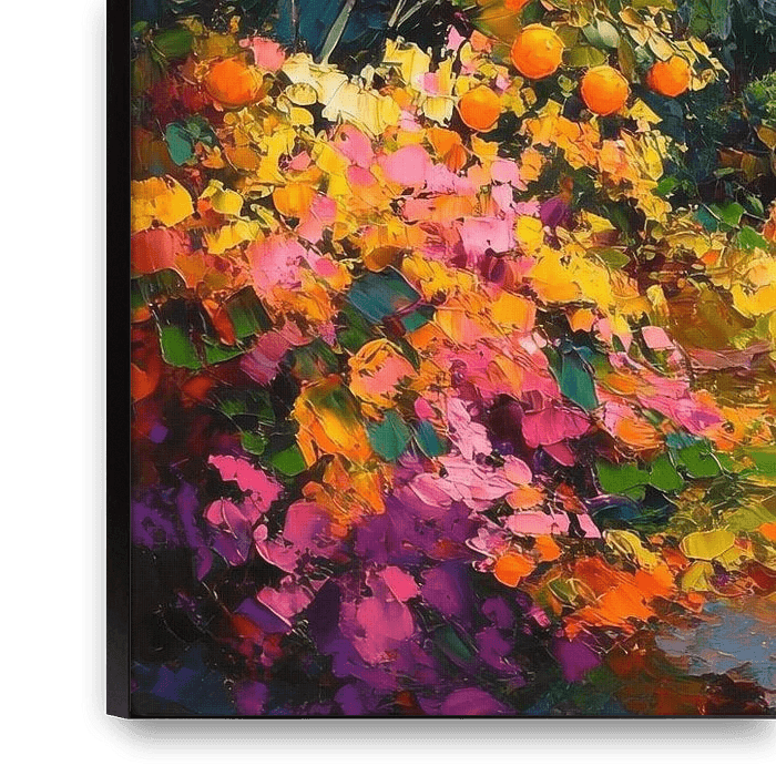Ein einladendes Paradies voller Farben und Leben entfaltet sich: Ein charmantes, weißes Haus mit einem terrakottafarbenen Dach thront inmitten üppiger, blühender Gärten. Orangene Früchte hängen verlockend von Bäumen, während die sonnendurchfluteten Pfade den Betrachter zu diesem idyllischen Rückzugsort führen, wo Wärme und Natur…