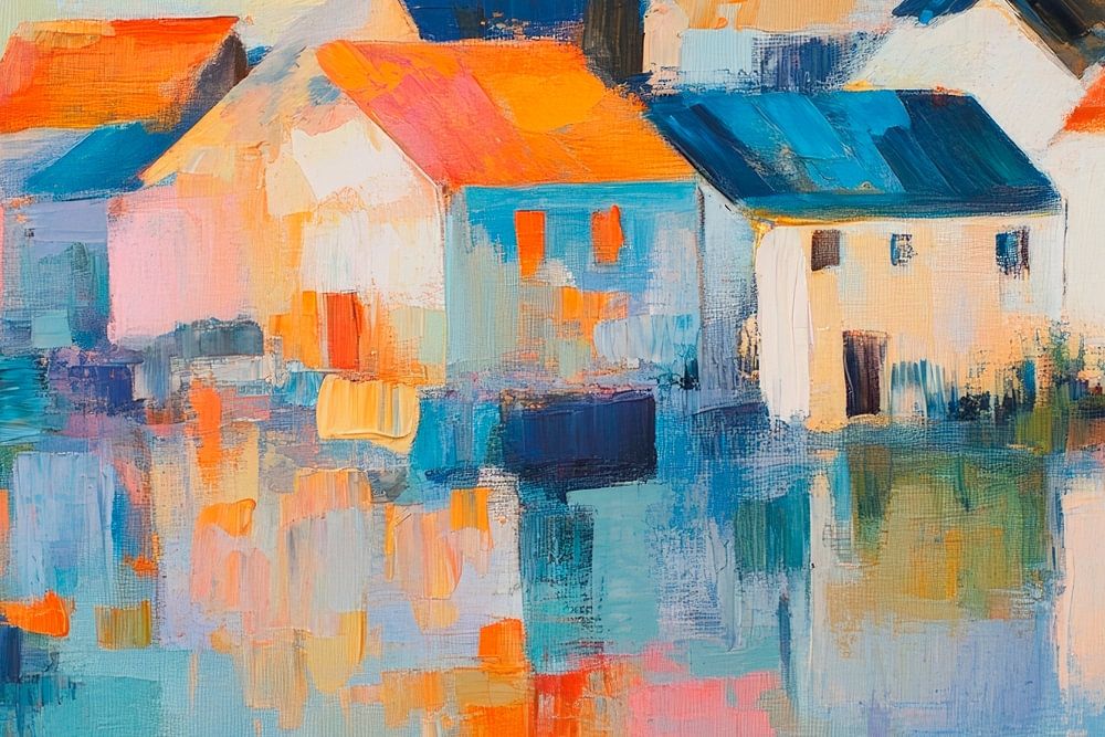 In sanften Pastelltönen strahlen die verträumten Häuschen am Wasser, während ihre bunten Dächer in der sanften Spiegelung tanzen. Diese harmonische Szenerie weckt Sehnsucht und Gemütlichkeit und eignet sich hervorragend für ein Wohnzimmer, um eine idyllische, entspannte Atmosphäre zu schaffen. Ideal für Gespräche und Zeit mit Freunden.