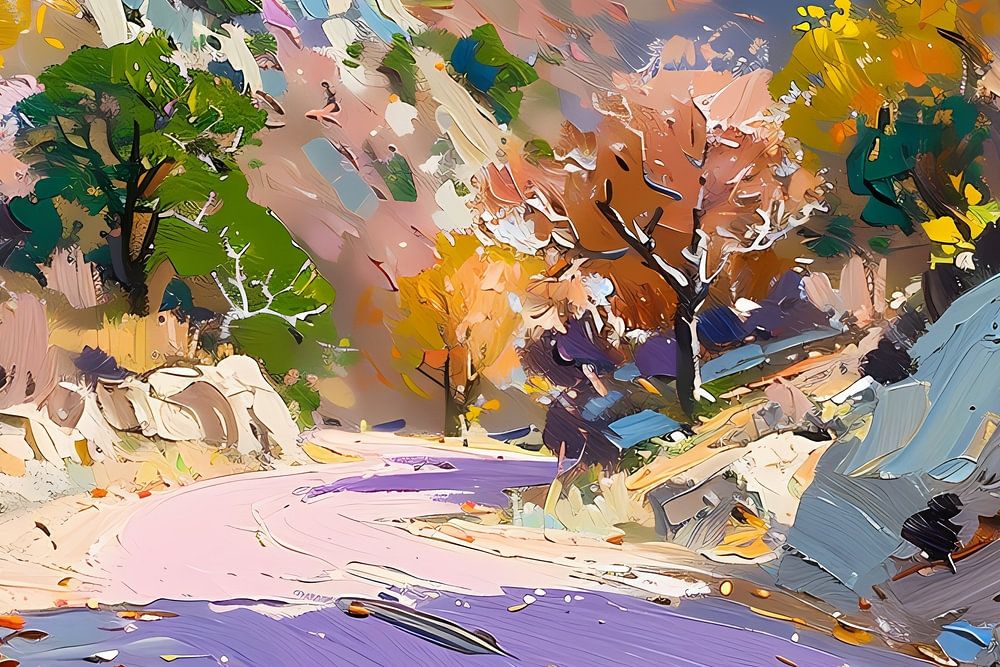 Dieses schöne Gemälde zeigt eine farbenfrohe Herbstlandschaft mit einer kurvenreichen Straße durch ein malerisches Tal. Die lebhaften Farben der Blätter reichen von leuchtendem Gelb bis zu tiefem Orange und Rot und vermitteln ein warmes und einladendes Gefühl. Die Straße windet sich durch die Landschaft, umgeben von Bäumen und Felsen, und lädt den Betrachter ein, die natürliche Schönheit dieser ruhigen Szene zu erkunden. Dieses Kunstwerk eignet sich perfekt für jeden Raum, der einen Hauch von Farbe und Ruhe braucht, wie z. B. ein Büro oder ein Schlafzimmer. Seine dynamische Farbgebung und sein impressionistischer Stil machen es zu einem Blickfang, der jeden Raum erhellt.