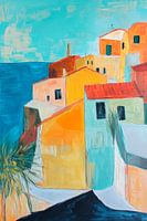 In einem sonnendurchfluteten Küstendorf verschmelzen strahlende Farben mit sanften Formen. Gelbe, orangefarbene und mintgrüne Häuser drängen sich anmutig am Hang, während das glitzernde Meer im Hintergrund für eine erfrischende Tiefe sorgt. Palmen wiegen sich sanft im Wind und verleihen der Szenerie ein mediterranes Flair, das zum…