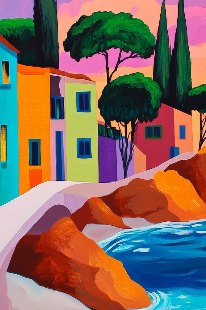 Lebendige Farben und traumhafte Landschaften verschmelzen in dieser Szenerie, wo sanfte Wellen die Küste küssen und leuchtende Häuser zum Verweilen einladen. Die harmonische Stimmung unter einem geheimnisvollen Mond strahlt Ruhe und Inspiration aus – perfekt für eine kreative Ecke im Wohnzimmer, wo Träume und Kreativität blühen können.