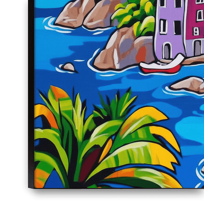 Bestelle dieses Landschafts-Wandbild Bunte Küstenstadt von Poster Art Shop als Reproduktion auf Leinwand, Alu-Dibond, als Poster, Fototapete oder Acrylglasbild.