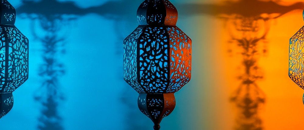 Schimmernde Lichter tanzen an der Wand und entfalten ein harmonisches Farbspiel in Blau und Orange. Die filigranen Muster der Laternen erzählen Geschichten aus fernen Ländern und schaffen eine gemütliche Atmosphäre. Ideal für das Wohnzimmer, wo es als Blickfang und stimmungsvolles Element für gesellige Abende dient.