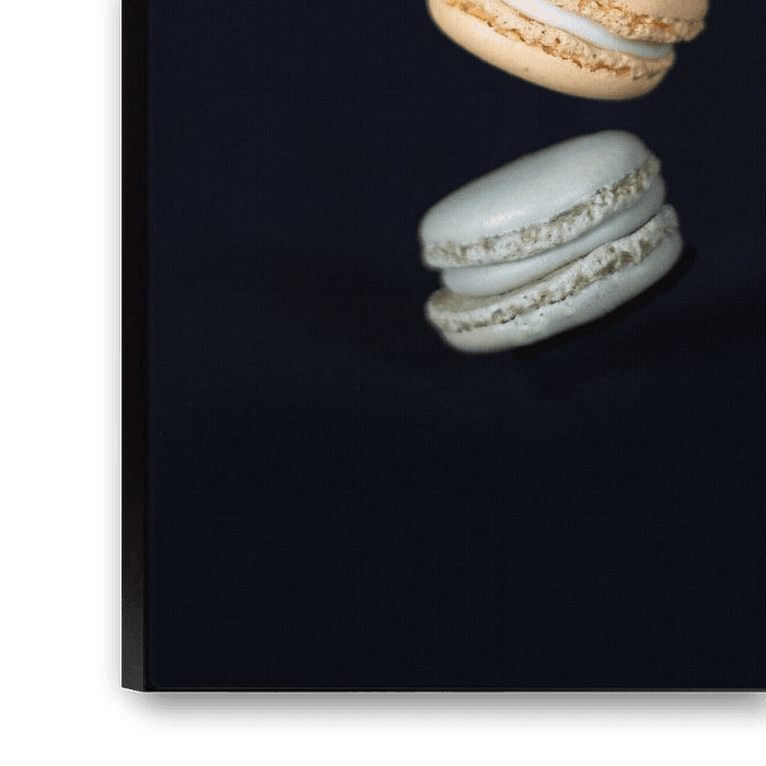 Auf diesem Bild schweben drei Macarons in perfekter Harmonie vor einem tiefschwarzen Hintergrund. Die Macarons scheinen schwerelos zu sein, als ob sie jeden Moment durch eine unsichtbare Kraft in Bewegung gesetzt werden könnten. Ihre zarte Textur und die sanften Farbtöne - von Pastellrosa bis Cremebeige - bilden einen schönen Kontrast zu der dunklen Leere um sie herum. Dieses minimalistische Bild stellt die Macarons in den Mittelpunkt und hebt ihre subtilen Details und perfekt runden Formen hervor. Der schwarze Hintergrund dient als Bühne, die die Eleganz und Raffinesse dieser klassischen französischen Leckereien unterstreicht.