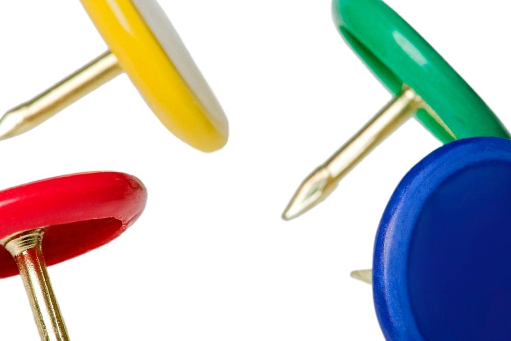 Vier bunte Reißzwecken als Makro Aufnahme in den Farben rot, blau, grün, gelb.