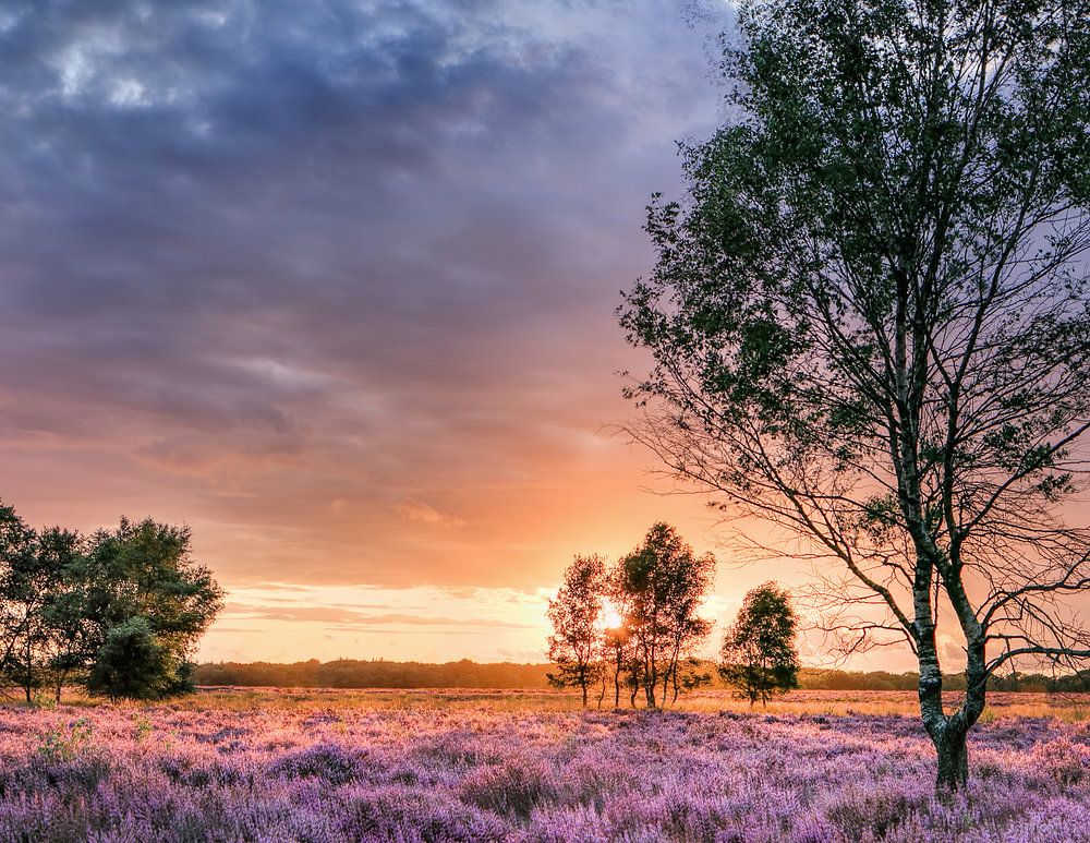 Birke auf einem Moorland auf einem Sonnenuntergang mit der Sonne in der Eröffnung einer Trennung von dem Stamm positioniert, Niederlande