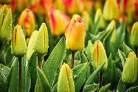 Frühling mit bunten Tulpen unter den Regentropfen. Große Tropfen auf den Blumen während eines großen Regens. Die Farben Grün, Gelb und Rot.