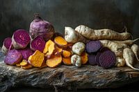 Ein erdiges Stillleben, das die lebendige Farbenpracht heimischer Wurzeln zelebriert. Die satte lila und orangefarbene Vielfalt strahlt eine warme, einladende Energie aus. Perfekt für die Küche, wo kulinarische Kreativität blühen kann und das Auge beim Kochen erfreut wird. Ein wahres Fest für die Sinne!