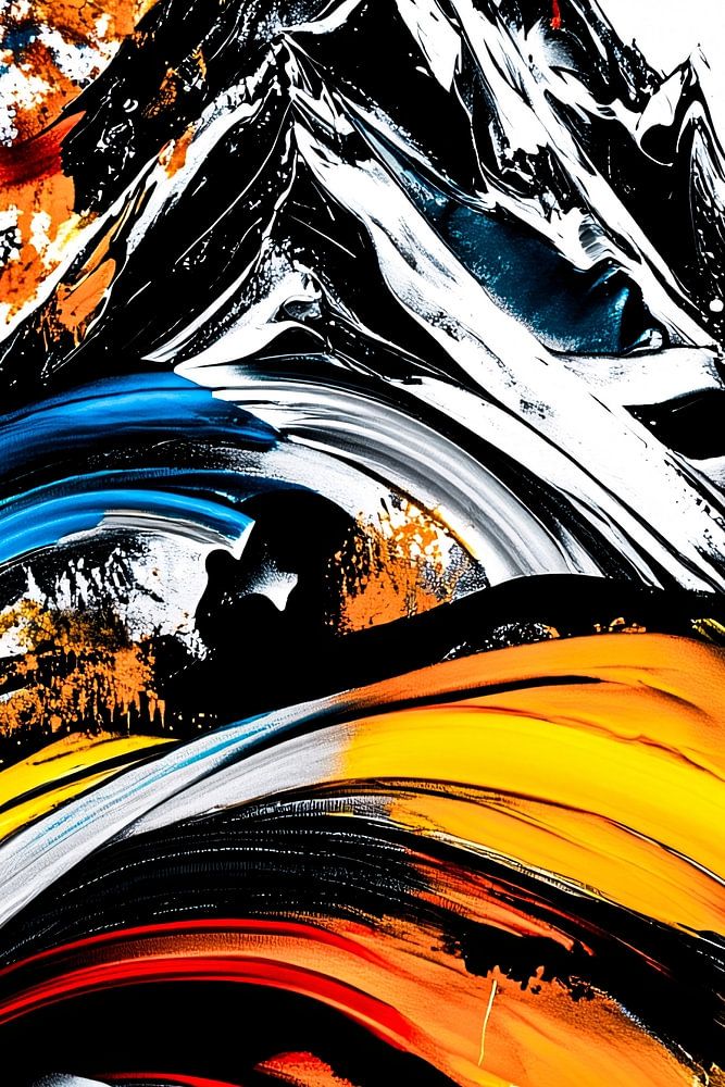 Ein einzigartiges Kunstwerk, das durch eine Kombination aus kräftigen Farben und abstrakten Linien Energie und Bewegung ausstrahlt. Der Berg in der Mitte bildet einen dynamischen Brennpunkt, umrahmt von leuchtenden orangefarbenen und blauen Farbtupfern. Dieses Design vereint natürliche und moderne Elemente und ist ein perfekter Blickfang in jedem Raum. Ideal für alle, die ein Highlight suchen, das die Atmosphäre eines Raumes sofort auf ein höheres Niveau hebt.