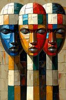Dieser einzigartige Kunstdruck zeigt eine faszinierende Komposition aus drei Masken in einem farbenfrohen und geometrischen Stil, der an den Kubismus erinnert. Die Masken bestehen aus Blöcken in leuchtenden Farben wie Rot, Blau, Gelb und Grün und vermitteln ein dynamisches und modernes Gefühl. Dieses Design ist perfekt für alle, die ein…