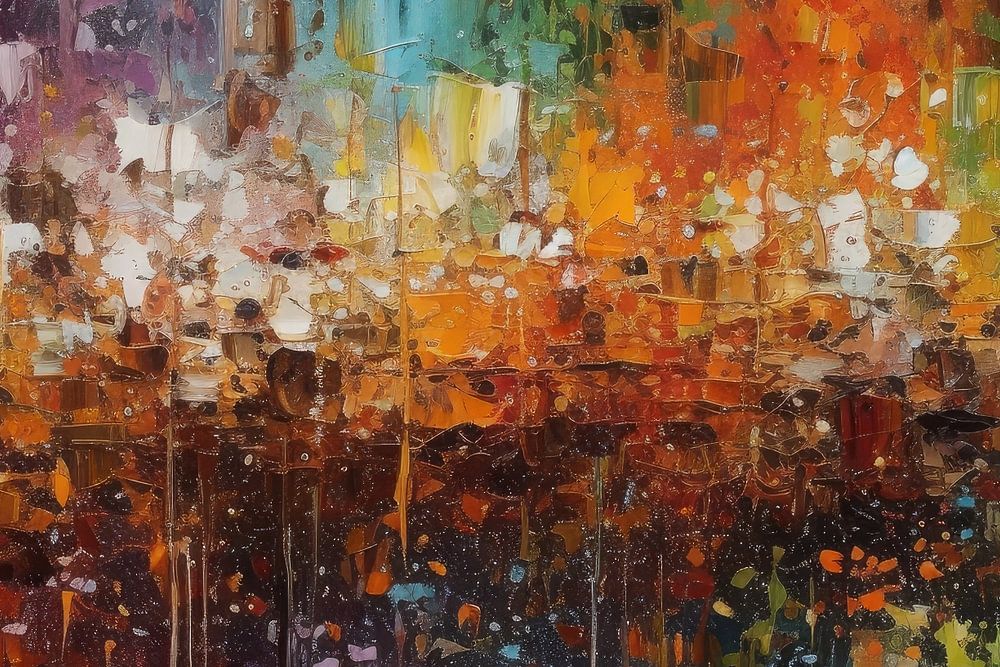 "Colourful Cosmic Ballet" ist ein beeindruckendes digitales Wandkunstwerk, das den Betrachter auf eine ästhetische Reise durch ein farbenfrohes Universum aus Farbe mitnimmt. Dieses faszinierende Kunstwerk vereint eine Vielzahl von Farben in einer lebhaften Komposition aus kräftigen Farbspritzern und strukturierten Texturen. Es ist ein farbenfrohes Fest, bei dem sich ungeordnete Farbspritzer in einem Regenbogen von Farbtönen kreuz und quer über die Leinwand zu ziehen scheinen. Von leuchtenden Rot- und Orangetönen bis hin zu kühlen Blau- und Violetttönen ist jeder Farbton intensiv und tief und bildet einen kühnen Kontrast zu den anderen Farben. Das Werk wird durch eine komplexe Schichtung, die den Farbspritzern eine greifbare Dimension verleiht, noch akzentuiert. Die Farbschichten scheinen in mehreren Schritten aufgebaut worden zu sein, was zu einer Tiefe und Vielseitigkeit führt, die die zweidimensionalen Grenzen der Leinwand in Frage stellt. Diese Textur schafft eine dynamische Landschaft mit Höhen und Tiefen, in der sich die Farben überlagern und in einem zufälligen, aber ausgewogenen Muster nebeneinander bestehen. Colourful Cosmic Ballet" ist ein aufregendes Spektakel aus Farbe und Textur, ein Kunstwerk, das die Herausforderung annimmt, zu experimentieren und die Konventionen der abstrakten Kunst zu brechen. Es ist ein visueller Leckerbissen, der den Betrachter dazu einlädt, die vielen Schichten und Nuancen von Farbe und Form zu erforschen, ein Werk, das durch seine Vielseitigkeit und Schichtung sowohl die Augen als auch den Geist anregt.