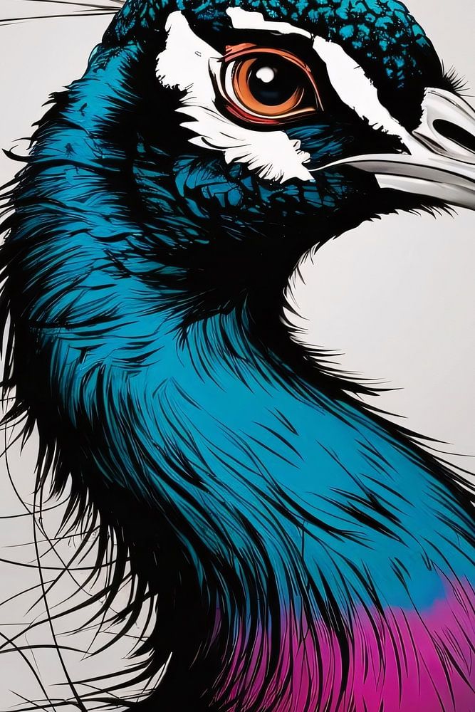 Dieses farbenfrohe Design zeigt einen wunderschön stilisierten Pfau mit einem einzigartigen digitalen Finish. Das Bild besticht durch seine leuchtenden Farben und detaillierten Linien, die die Eleganz dieses majestätischen Vogels perfekt einfangen. Mit seinen Blau-, Rosa- und Orangetönen zieht das Design sofort die Aufmerksamkeit auf sich und bringt eine dynamische Energie in jeden Raum. Dank seines künstlerischen Ansatzes eignet es sich für moderne Innenräume und setzt einen auffälligen Akzent in einem Schlafzimmer oder Büro. Die Verwendung kräftiger Farben und scharfer Linien verleiht dem Stück ein modernes Flair, während der Pfau selbst für klassische Schönheit steht. Eine gute Wahl für alle, die moderne Kunst und Tiere lieben und etwas Farbe in ihre Umgebung bringen wollen.