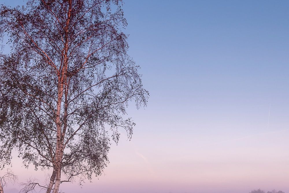 Frische Herbstfarben bei Sonnenaufgang mit einer einzelnen Birke in einem Heidefeld mit dem Kontrast der intensiven blauen Atmosphäre im Hintergrund und der Vegetation, die durch den Morgentau in den Magenta- und Orangetönen der aufgehenden Sonne zu sehen ist.