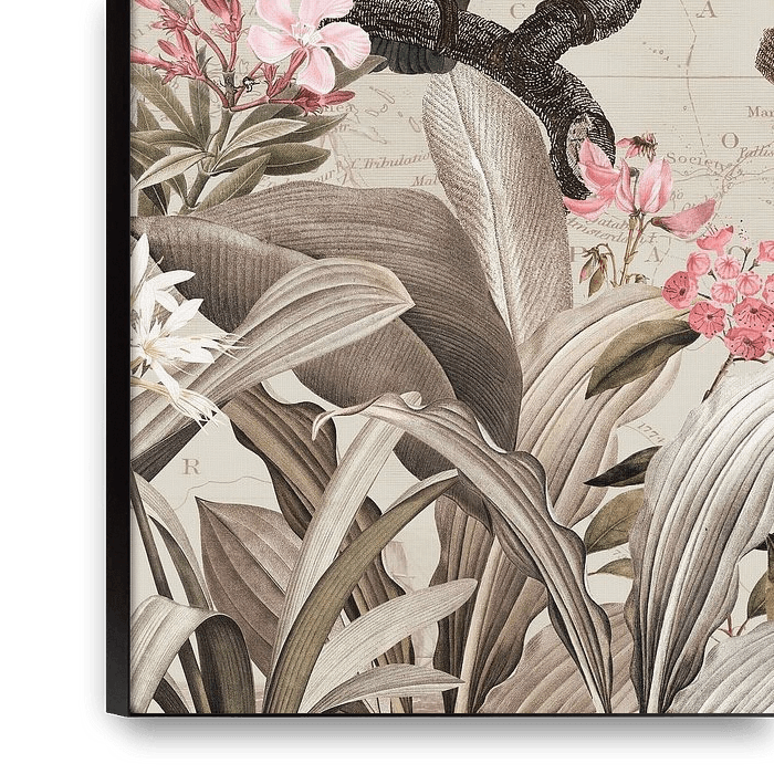 Bestelle dieses Blumen-Wandbild Bunte nostalgische exotische Papageien in einem tropischen Dschungel 2 von Floral Abstractions als Reproduktion auf Leinwand, Alu-Dibond, als Poster, Fototapete oder Acrylglasbild.