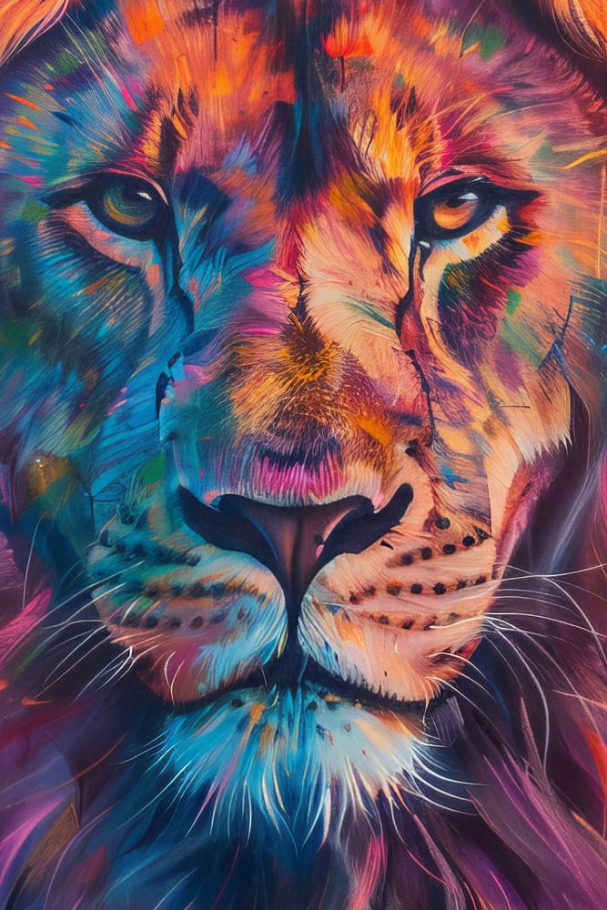 Colourful King" ist das beeindruckende Porträt eines Löwen in einer leuchtenden Mischung aus blauen, orangen und rosafarbenen Tönen. Die detaillierten Pinselstriche erwecken den ausdrucksstarken Gesichtsausdruck und die üppige Mähne des Löwen zum Leben und vermitteln ein Gefühl von Macht und Majestät. Die kontrastreichen Farben schaffen ein dynamisches und auffälliges Bild, das sich perfekt für moderne Innenräume eignet, die einen Hauch von wilder Schönheit und Energie zu schätzen wissen. Dieses Kunstwerk ist eine Hommage an den König des Dschungels in seiner ganzen Pracht.