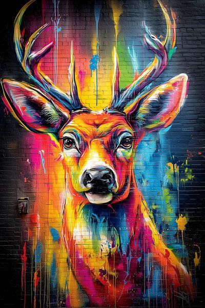 Ein Hirsch in bunten Neon Farben im Stil einer Fassadenmalerei.