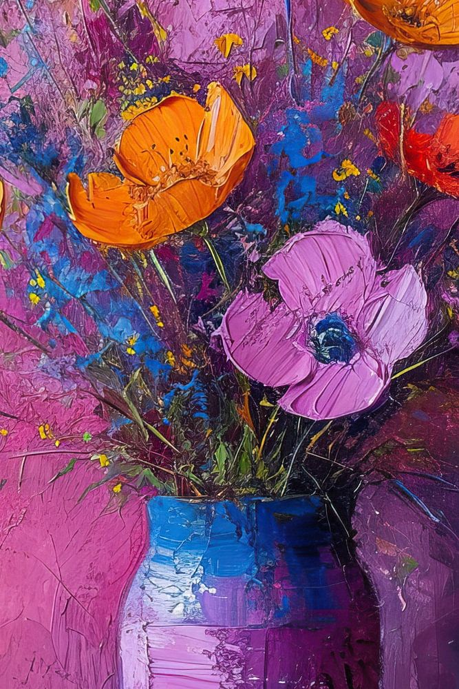 Details: Blumen, Stillleben, farbenfroh, Vase, Textur, lebendig, modern, Kunst, abstrakt, Impressionismus