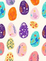 Ein lebhaftes, sich wiederholendes Muster aus illustrierten Ostereiern in verschiedenen leuchtenden Farben und dekorativen Stilen. Jedes Ei ist mit einfachen, handgezeichneten Details verziert, wodurch eine verspielte und fröhliche Komposition entsteht. Der helle Hintergrund verleiht dem Design eine frische und vielseitige Note, sodass…