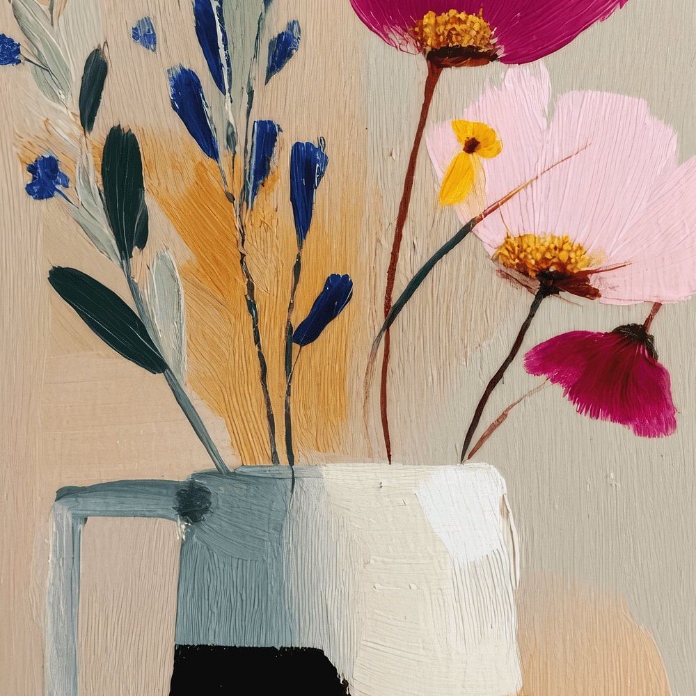 Buntes Stillleben mit Blumen im Landhausstil. Ein besonderer Blickfang für Ihr Interieur! Wählen Sie das Format und das Material für dieses Werk und machen Sie es zu Ihrem eigenen.