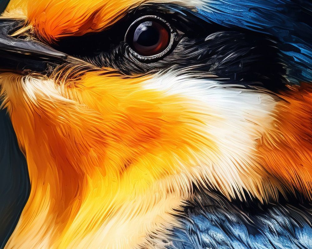 Farbenfrohes Vogelporträt | Lebendiges Gefieder - In diesem farbenfrohen Porträt zieht ein Vogel mit wunderschön gefärbten Federn die Aufmerksamkeit auf sich; die zartgelbe und orangefarbene Brust steht in harmonischem Kontrast zu dem tiefblauen und schwarzen Gefieder. Der Hintergrund ist dezent und dunkel und hebt das Tier hervor, während die Pinselstriche eine dynamische und fast fühlbare Textur ergeben.