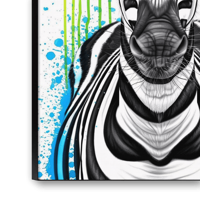 Dieser einzigartige Kunstdruck kombiniert die wilde Schönheit eines Zebras mit der Lebendigkeit moderner Street Art. Das Design mit seinen kräftigen schwarzen und weißen Streifen und leuchtenden Farbtupfern wie Grün, Lila und Orange bringt dynamische Energie in jeden Raum. Dieser Druck ist ideal für ein Büro oder ein Wohnzimmer und bringt einen Hauch von Natur und eine Farbexplosion in Ihr Interieur. Die abstrakte Tropfentechnik erinnert an den Geist von Jackson Pollock, während die leuchtenden Farben dem Werk ein modernes, zeitgenössisches Flair verleihen. Dieses Werk ist perfekt für Tierliebhaber und Liebhaber moderner Kunst und stellt eine auffällige Ergänzung für jede Kunstsammlung dar.