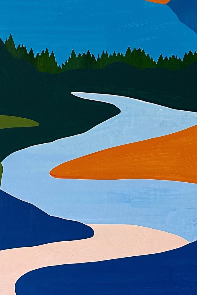 Dieses schöne minimalistische Gemälde zeigt einen ruhigen Fluss, der sich durch eine atemberaubende Berglandschaft schlängelt. Die einfachen, aber auffälligen Farbblöcke in Blau, Grün und Orange schaffen eine beruhigende und visuell ansprechende Szene, die perfekt in eine moderne Einrichtung passt. Das Design strahlt Ruhe und Frieden aus und ist somit die ideale Wahl für Räume, in denen Entspannung und Gelassenheit gefragt sind. Ob im Schlafzimmer, im Büro oder im Wohnzimmer, dieses Kunstwerk verleiht jedem Raum einen Hauch von Eleganz und Gelassenheit. Lassen Sie die Schönheit der minimalistischen Kunst Ihr tägliches Umfeld mit diesem einzigartigen und zeitlosen Gemälde bereichern.
