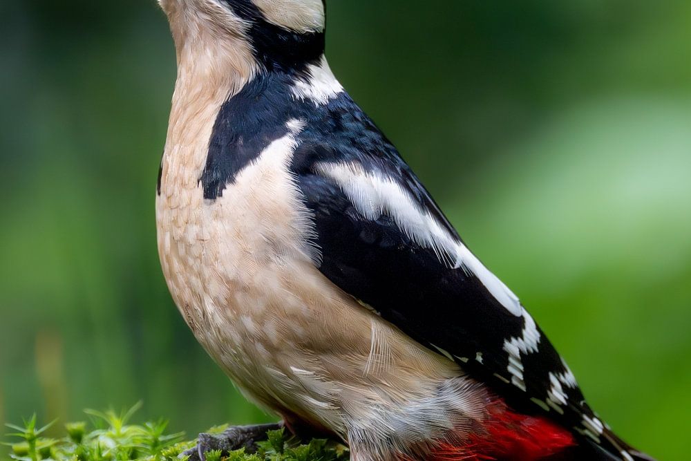Dieser Buntspecht scheint eine Weile ruhig zu sitzen, hält aber ständig Ausschau nach vorbeiziehenden Raubvögeln am Himmel. Ich mag die Haltung des Vogels und den Kontrast zwischen seinem roten Gefieder und dem grünen Moos sehr.