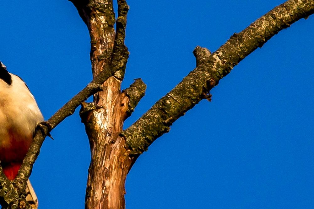 Buntspecht in der Spitze eines toten Baumes.