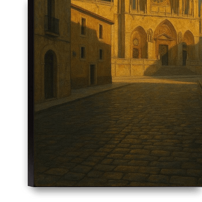 Burgos in Tranquil Silence fängt die prächtige Kathedrale in den letzten Strahlen des Sonnenuntergangs ein, ihre Zwillingstürme schimmern wie steinerne Kerzen gegen den dunkler werdenden Himmel. Die umliegenden Straßen liegen ruhig da - leere Kopfsteinpflaster reflektieren das schwache bernsteinfarbene Licht, die Fassaden glühen sanft…