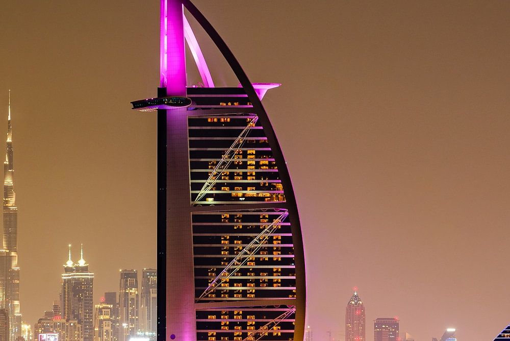 Im Vordergrund ist der Burj al Arab zusehen. Im Hintergrund ist der Burj Khalifa zu sehen.
