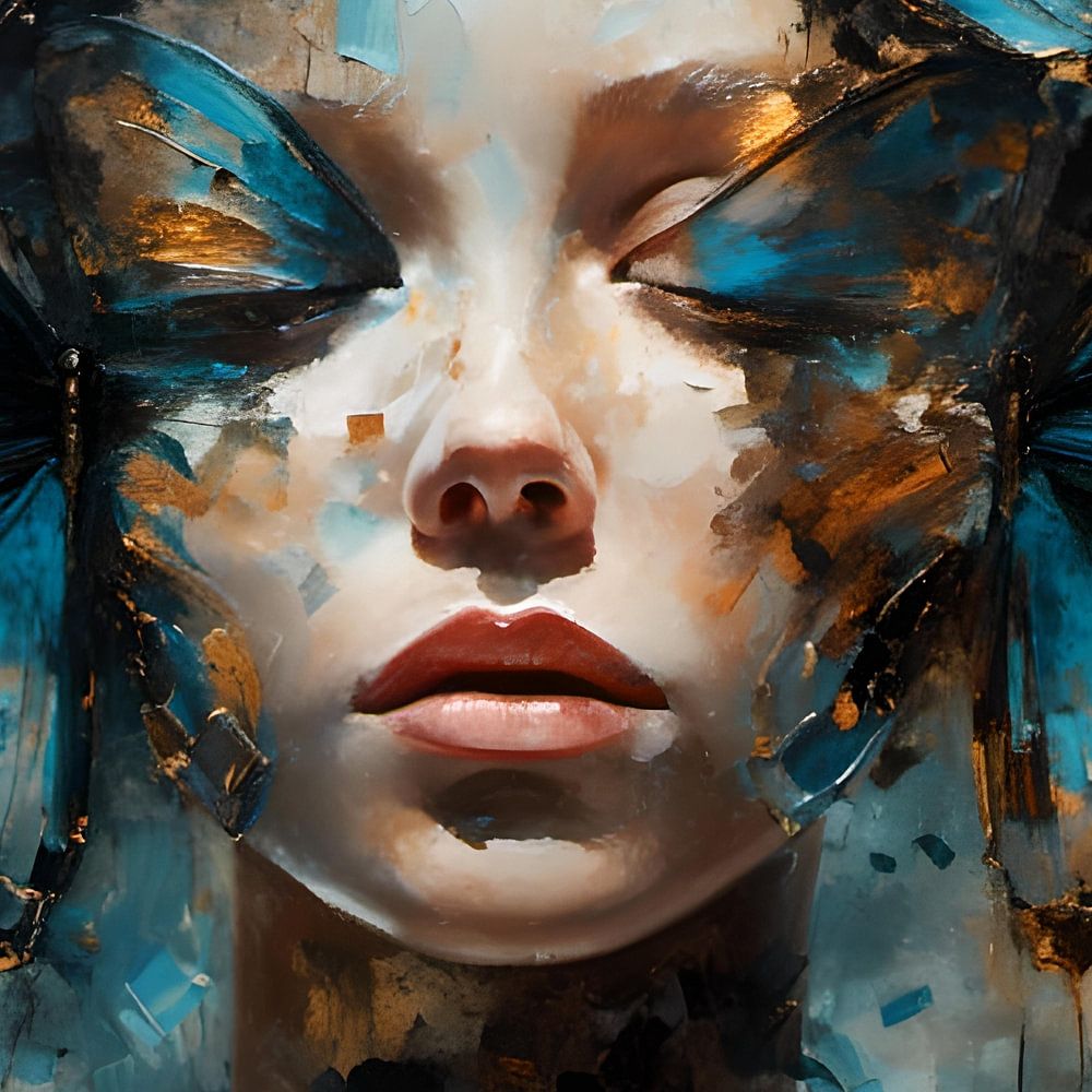 In der Mitte der Komposition ist das ruhige Gesicht einer Frau zu sehen, die ihre Augen geschlossen hat. Große blaue Schmetterlinge verdecken die Augen und vermitteln ein Gefühl der friedlichen Koexistenz mit der Natur. Die Verwendung von leuchtenden Blautönen und kontrastierenden Brauntönen erzeugt eine dynamische und emotionale visuelle Wirkung, die eine surreale und traumartige Atmosphäre hervorruft.