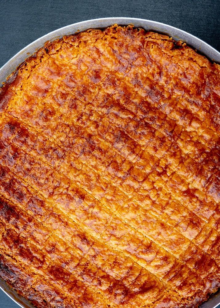 Butterkuchen in Butterkuchenform aus dem Ofen auf anthrazitfarbenem Hintergrund
