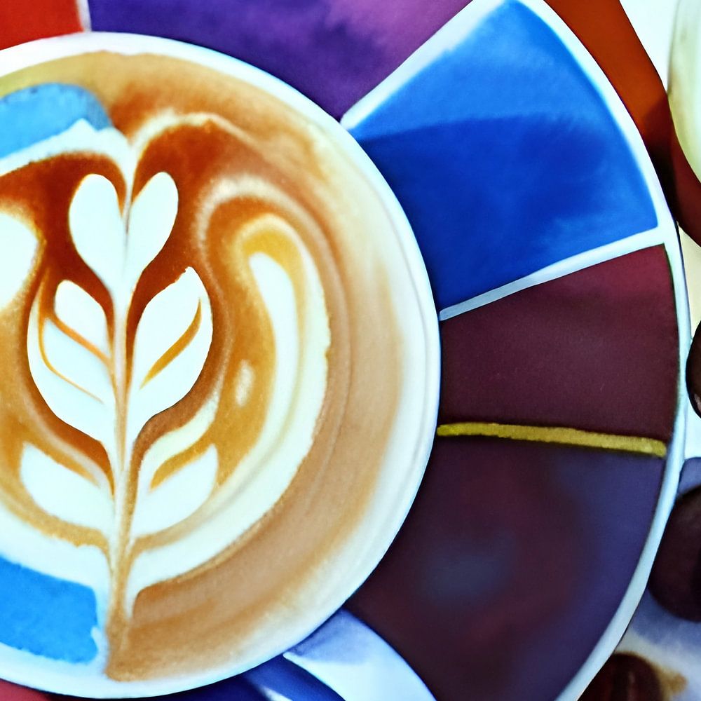 Das Kunstwerk zeigt eine Szene in einem modernen Café, in der ein Kaffeebecher im Mittelpunkt steht. Der Hintergrund ist mit abstrakten Formen und Mustern verziert, die an Kaffeebohnen und Dampf erinnern. Das Werk strahlt eine ruhige und gemütliche Atmosphäre aus, die perfekt zur Umgebung eines Cafés passt. Die Verwendung von kräftigen Farben und abstrakten Formen verleiht dem Werk eine moderne und zeitgemäße Note und zieht die Aufmerksamkeit des Betrachters auf sich.