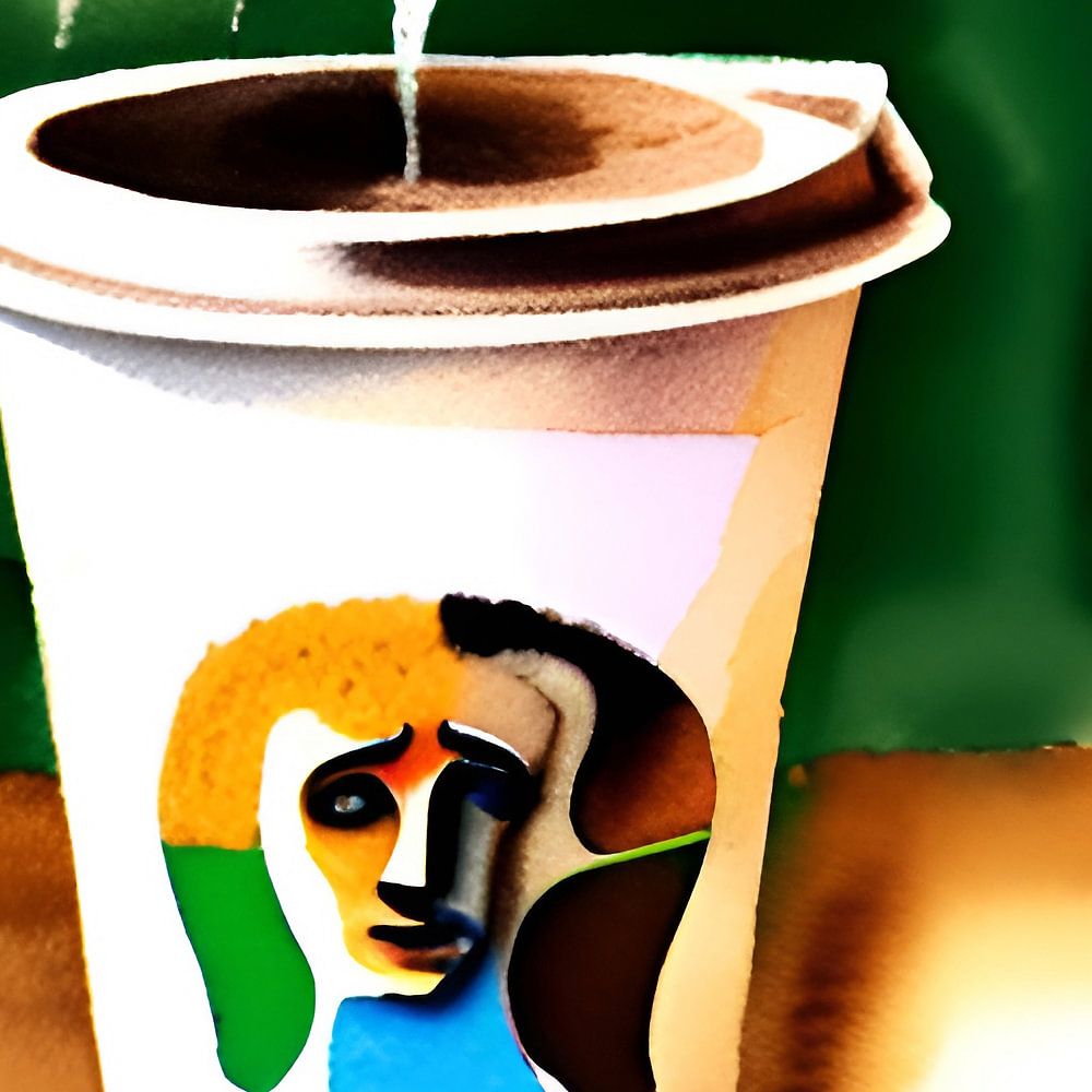 Das Kunstwerk zeigt eine Szene in einem modernen Café, in der ein Kaffeebecher im Mittelpunkt steht. Der Hintergrund ist mit abstrakten Formen und Mustern verziert, die an Kaffeebohnen und Dampf erinnern. Das Werk strahlt eine ruhige und gemütliche Atmosphäre aus, die perfekt zur Umgebung eines Cafés passt. Die Verwendung von kräftigen Farben und abstrakten Formen verleiht dem Werk eine moderne und zeitgemäße Note und zieht die Aufmerksamkeit des Betrachters auf sich.
