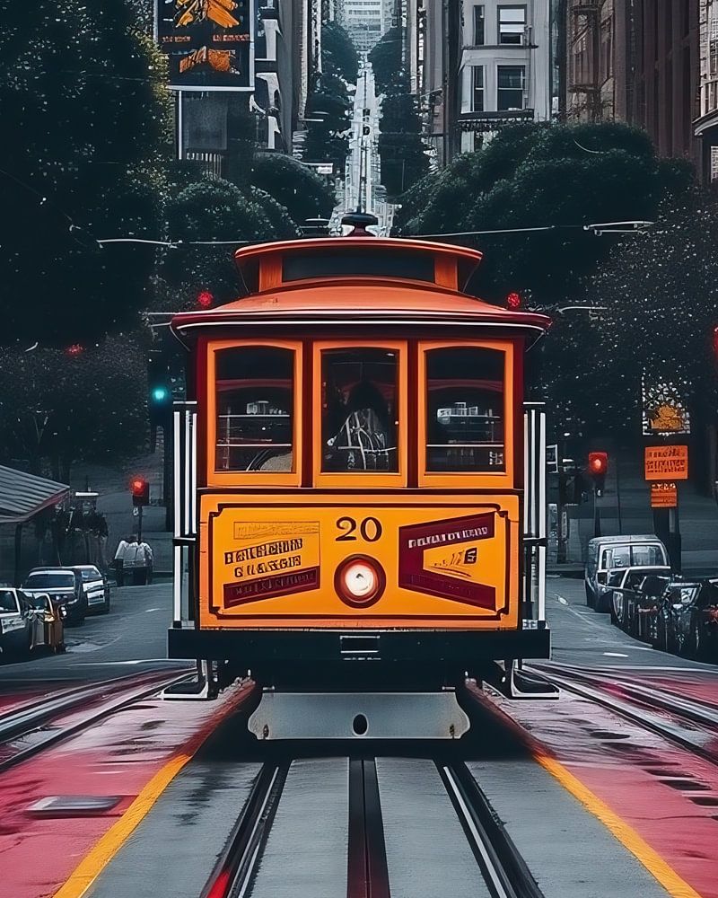 Bestelle das digitale Kunst Bild Cable Car in San Francisco von fernlichtsicht als Reproduktion auf Leinwand, Alu-Dibond, als Poster, Fototapete oder Acrylglasbild.